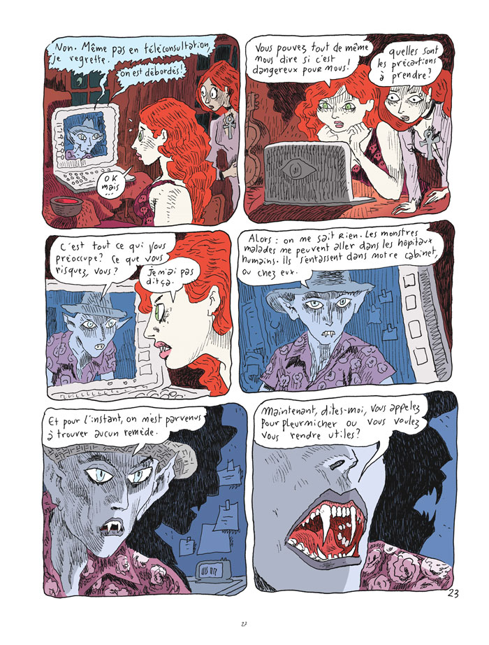 Même les vampires comme Aspirine doivent se confiner, d’autant que, vu son âge respectable – 300 ans – elle fait partie de la population à risque. Ce troisième tome d’Aspirine, Joann Sfar l’a entamé sur Instagram durant le confinement du printemps 2020. Plutôt que de se morfondre, il a préféré s’amuser à raconter les errances de son ado vampire préférée. Toujours rétive à l’autorité, Aspirine ne respecte pas trop les consignes et préfère porter secours aux monstres qui ont besoin d’aide, même si ça peut s’avérer dangereux.