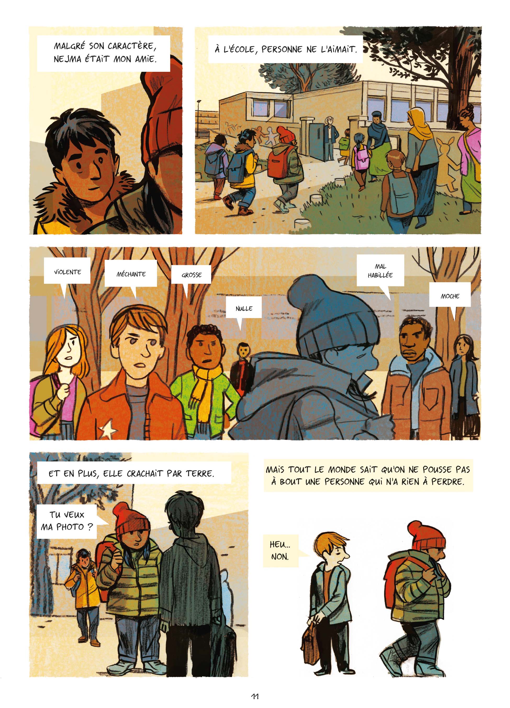 A l’école, personne n’aime Nejma. Elle est nulle, méchante, moche et mal habillée. En plus, elle crache par terre. Mais on ne lui dit jamais rien, parce que tout le monde sait qu’il ne faut pas pousser à bout une personne qui n’a rien à perdre.