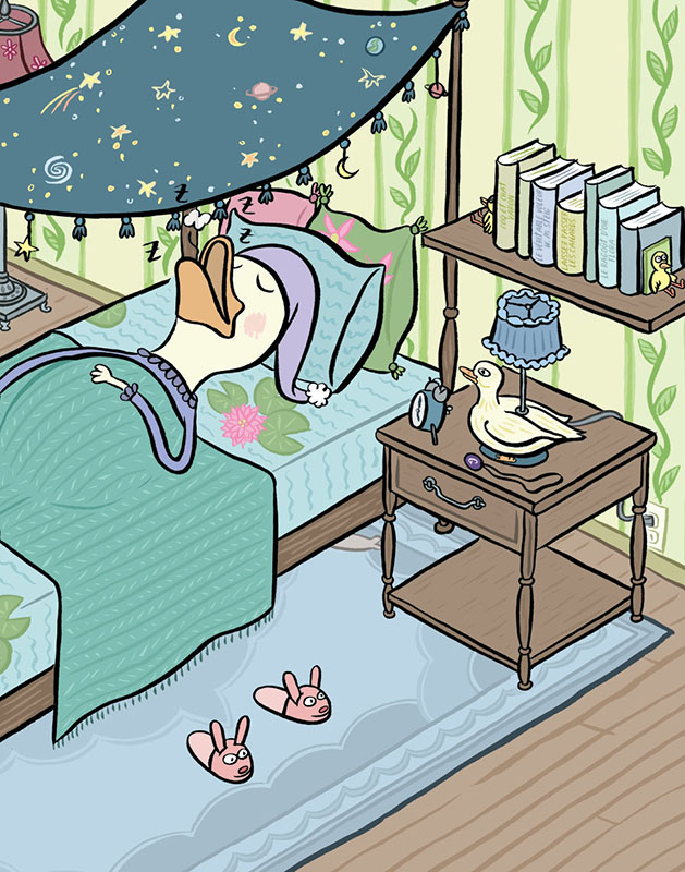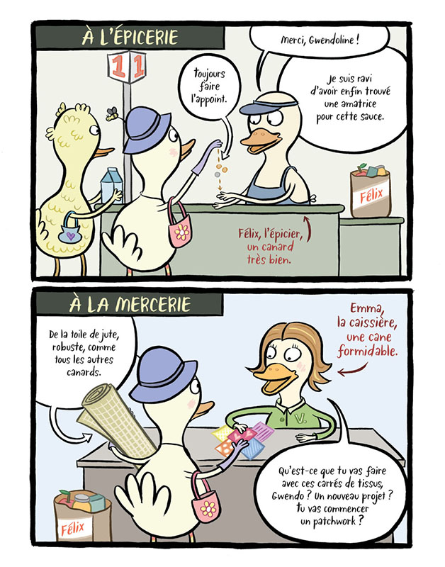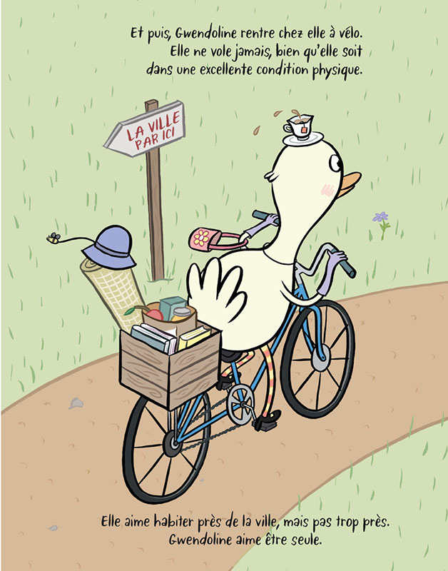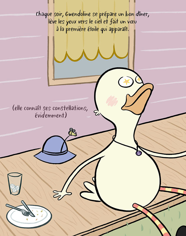 Gwendoline est une cane vraiment très soignée : elle fait chaque matin ses exercices de gymnastique, nage toujours avec une tasse de thé en équilibre sur la tête, et regarde chaque soir les étoiles avant d’aller se coucher. Alors quand Elvis, un canard artiste mal peigné, farfelu et vraiment pas très bien élevé, s’installe dans la maison voisine, elle est loin d’être ravie. Elle l’accueille cependant avec gentillesse et, surprise, se découvre plein de passions communes avec ce drôle de voisin. Ils deviennent rapidement les meilleurs amis du monde. Tout va pour le mieux jusqu’au jour où ils entendent d’autres canards dire de l’un d’eux : « Vraiment trop bizarre, ce canard ! »