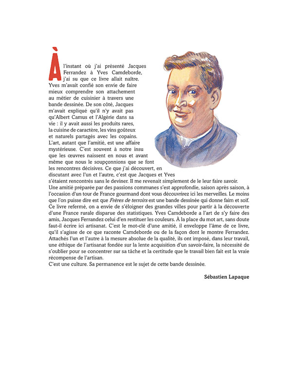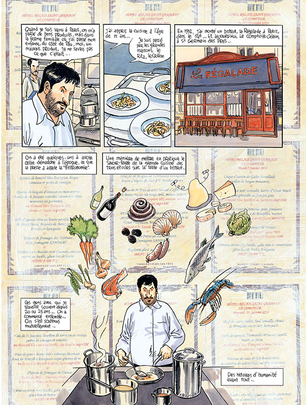 Ils sont apiculteurs, maraîchers, vignerons, bouchers... Ce sont les fournisseurs d’Yves Camdeborde depuis des années, avec qui ils partagent le goût du bien-manger et du bien-produire. Un an de rencontres avec les producteurs favoris du chef cuisinier, mis en dessin par Jacques Ferrandez, pour aller à la découverte de chasseurs de truffes, pêcheurs de brochets et vignerons aux quatre coins de la France.