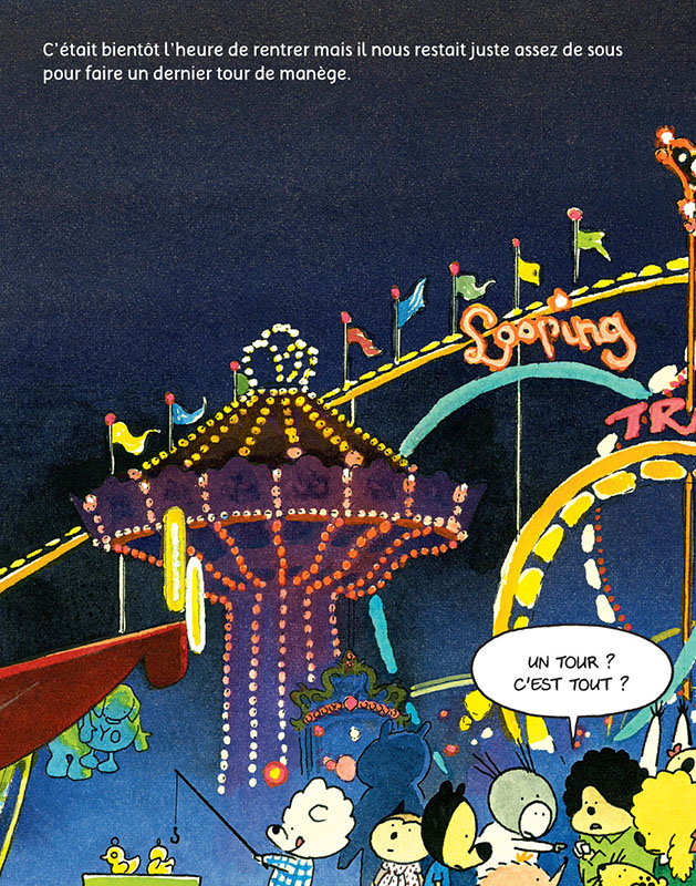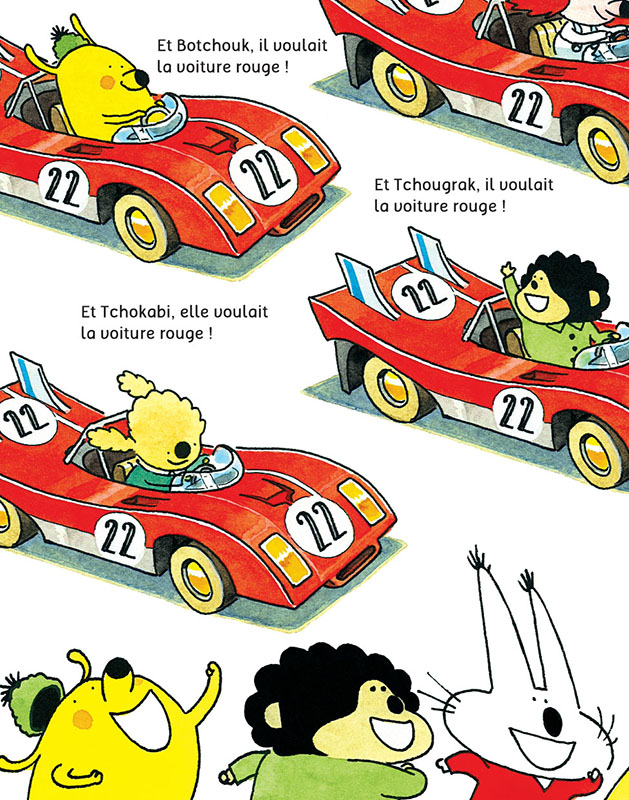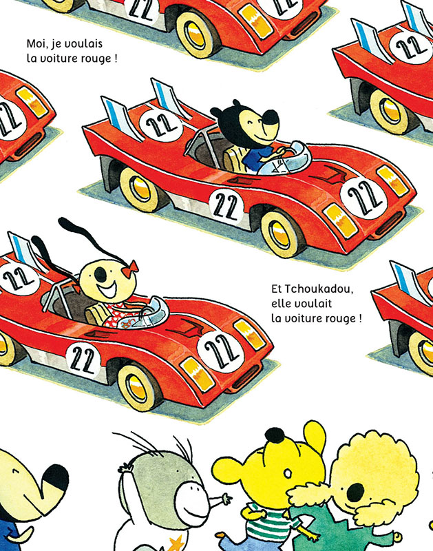 Vite ! C’est le dernier tour de manège pour les Tchouks, ils courent pour monter dans leur véhicule préféré... bien sûr, ils veulent tous la voiture rouge, la plus rapide. Mais c’est Tchoukrik qui l’a eue, alors Patatchouk, Tchoukadou, Tchougrak et les autres choisissent leur monture avant le départ, c’est hyper stressant. La course démarre, sus au pompon !