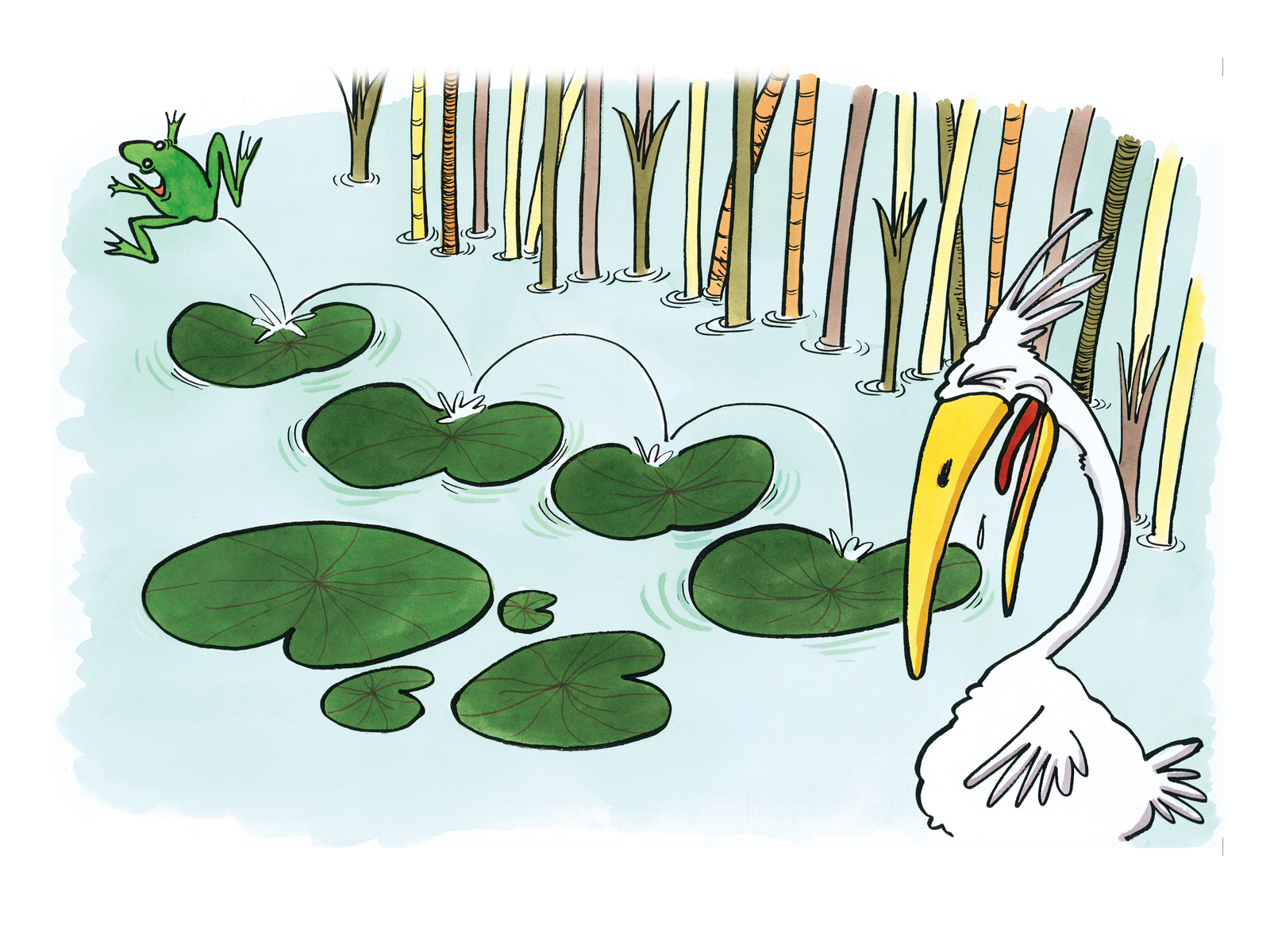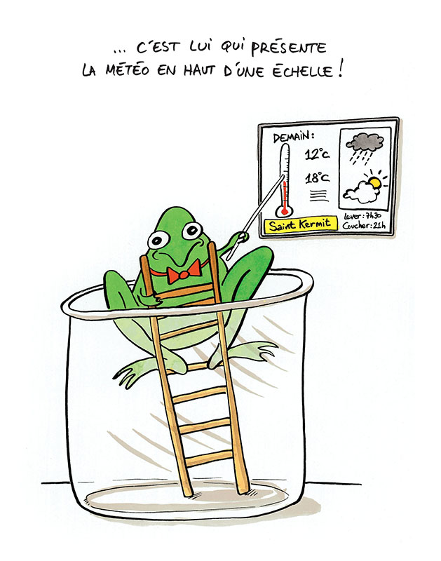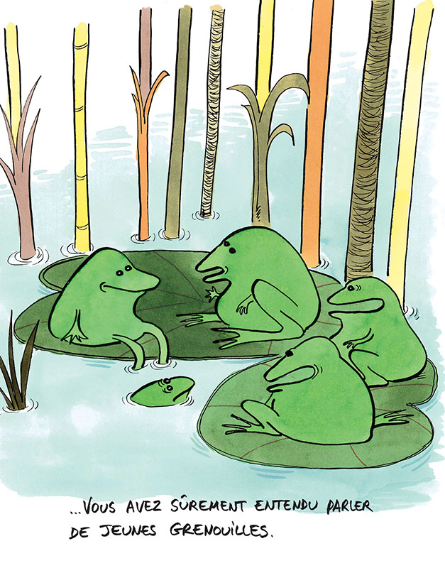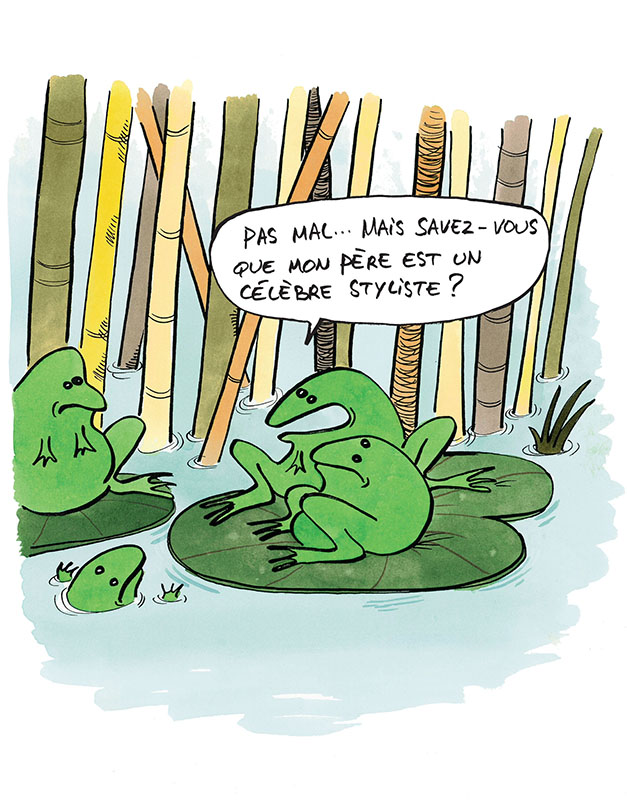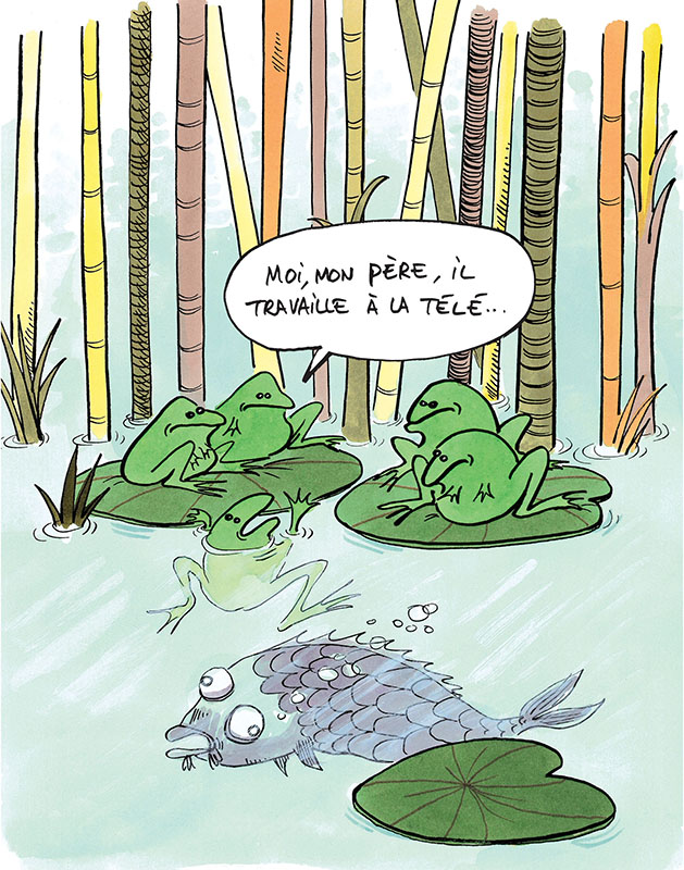 « Mon père, il présente la météo », « Mon père, il est toréador », « Mon père, il a participé à la recherche de la nouvelle mare. » Chacun y va de sa petite surenchère, cette après-midi-là, dans l'étang des grenouilles. Jusqu’à ce que l’une d’entre elles ose : « Moi, mon père, c’est un héron ! »