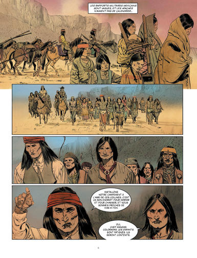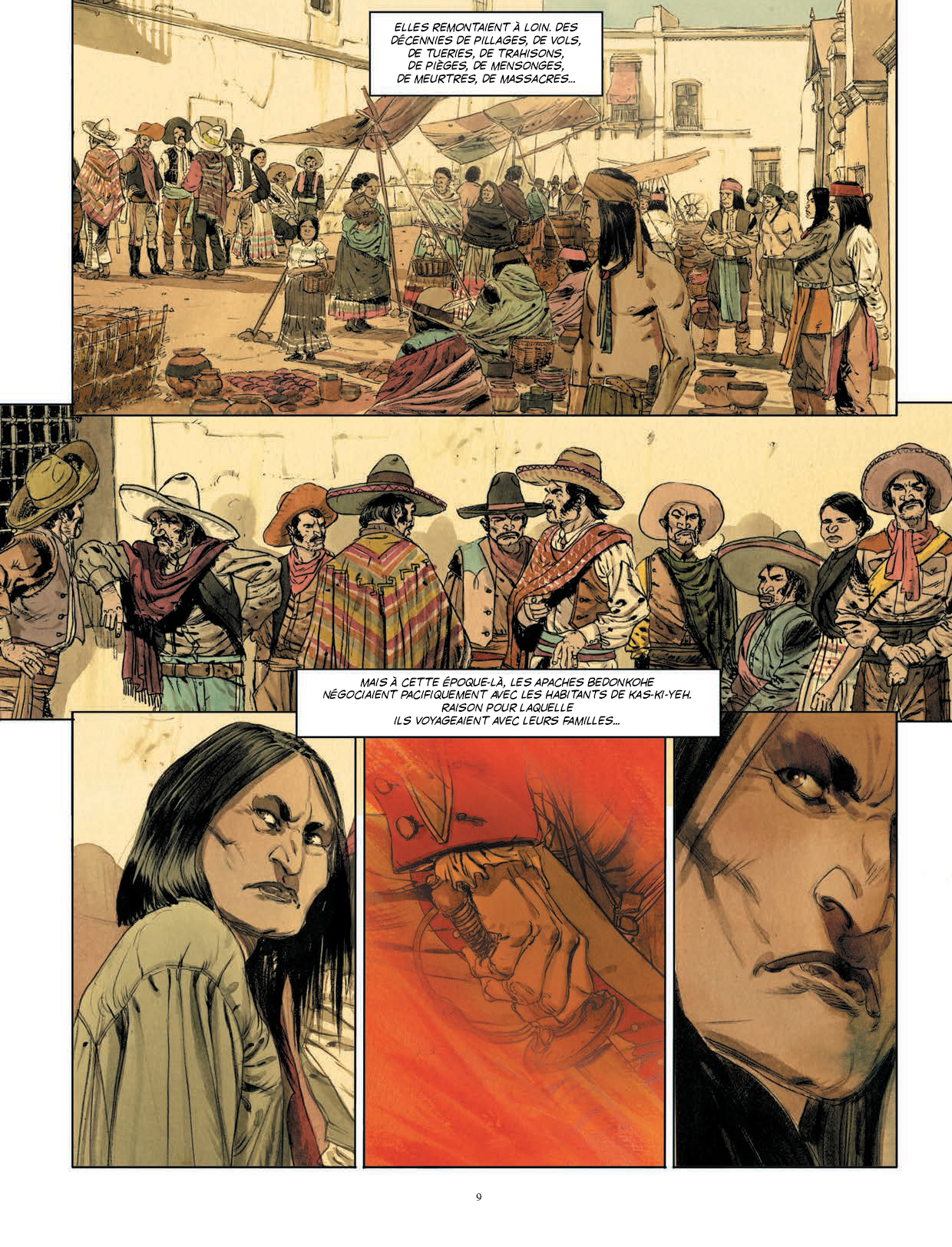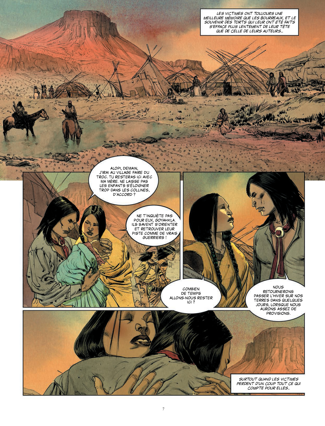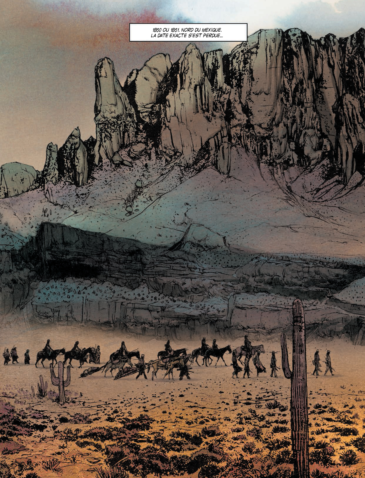 1850, dans les paysages grandioses du nord du Mexique. Goyahkla, guerrier et homme-médecine Apache, alerte ses compagnons : il a une vision d’horreur, il leur faut vite rentrer au camp. À leur arrivée, femmes et enfants ont été décimés. La guerre contre les Mexicains fait rage et est d’une violence sans limite. De cet épisode, Goyahkla gardera une haine inextinguible contre les Mexicains et un désir de vengeance qui guidera peut-être parfois à tort les décisions de celui qui sera bientôt renommé Geronimo… Mais la vraie guerre est peut-être plus sournoise, celle des blancs qui s’accaparent les terres sous couvert de collaboration.
