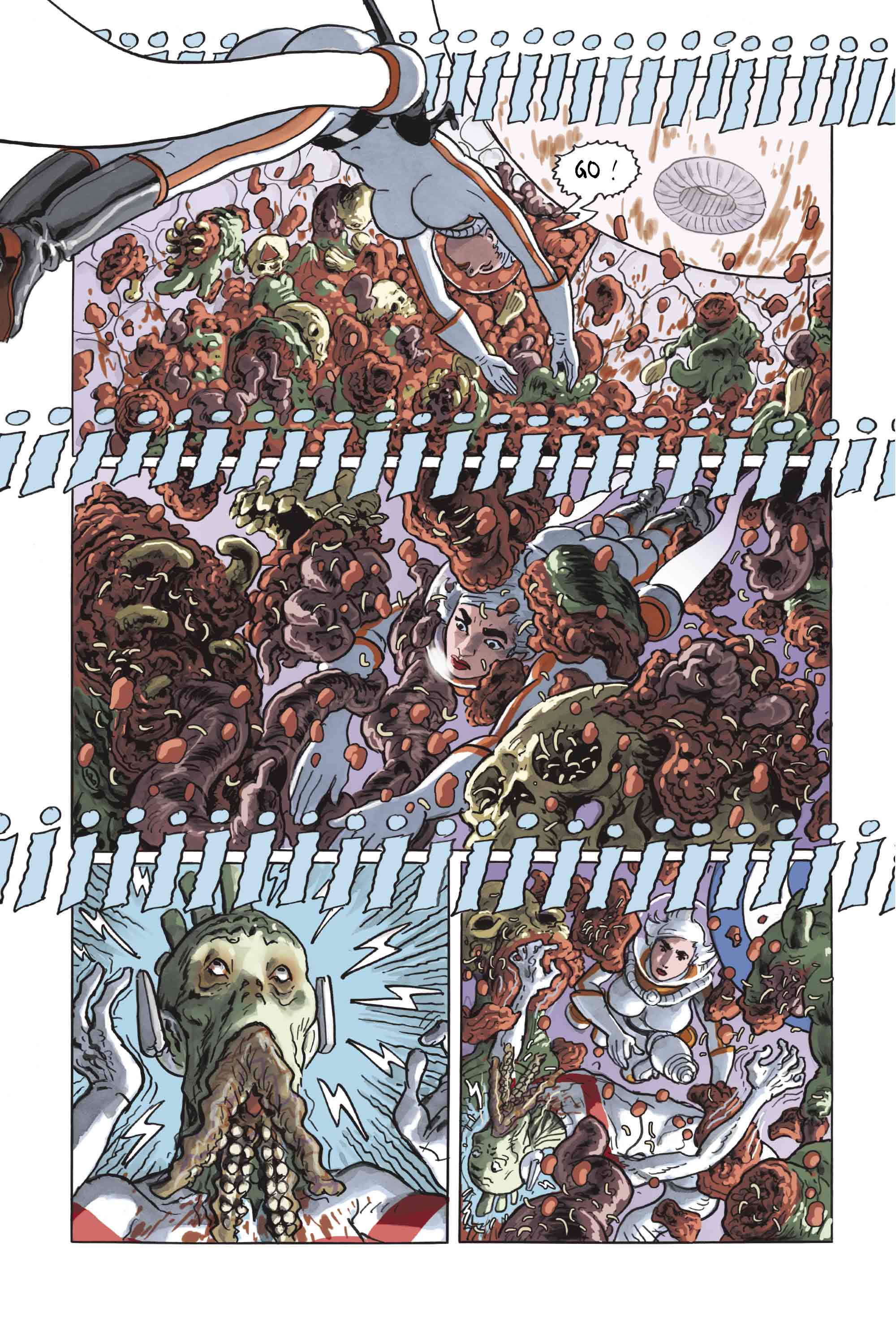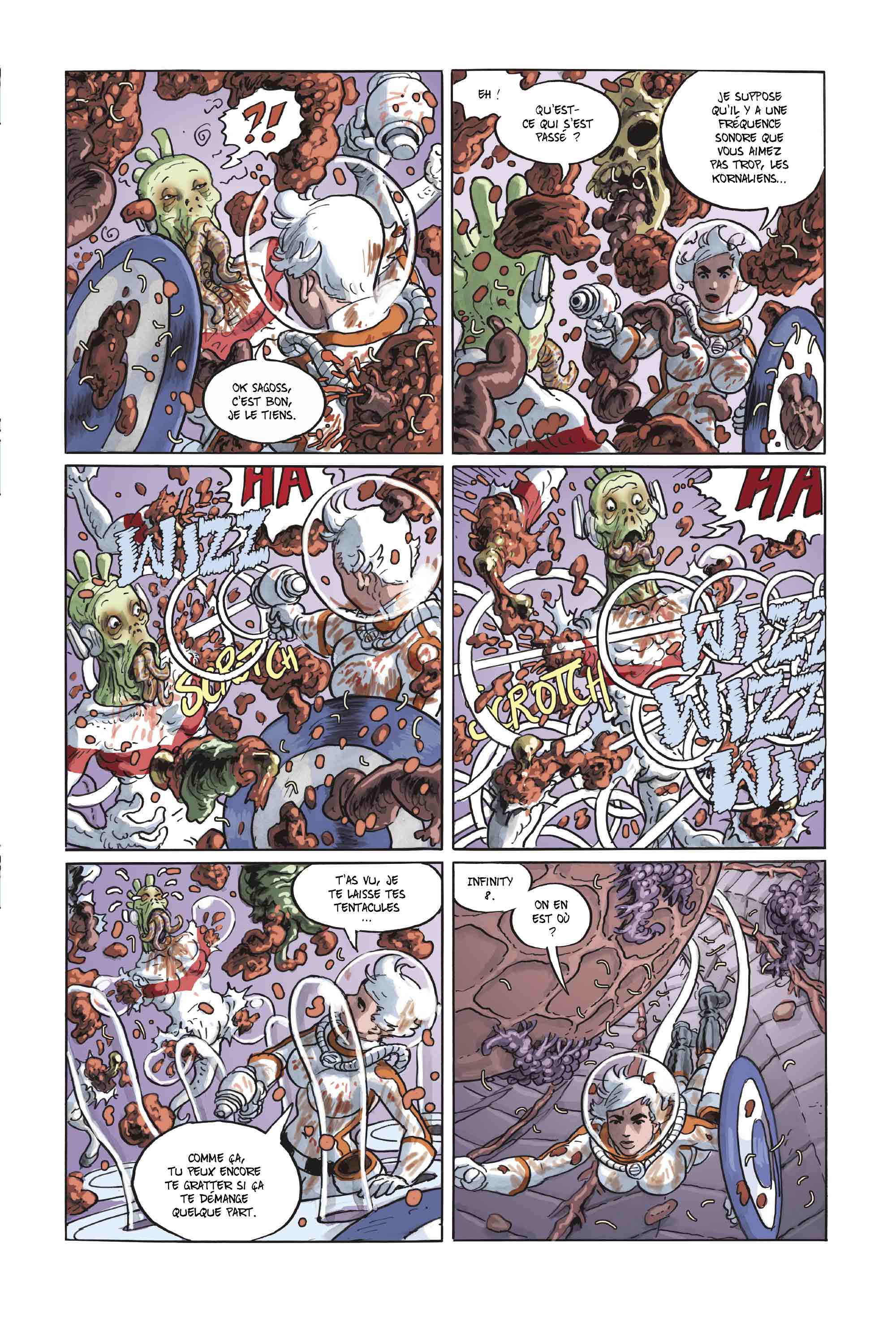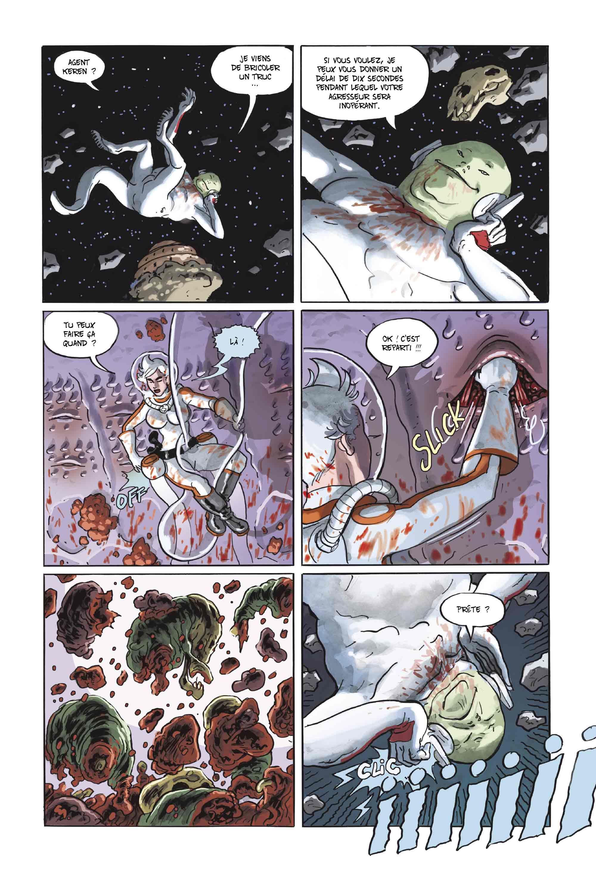 L’Infinity 8 ne tiendra pas longtemps : bombardé par le mégalomane Garal et ses sbires déterminés à le détruire pour s’approprier la nécropole, le vaisseau est en surchauffe et menace d’exploser d’une minute à l’autre. L’agent Keren ne tiendra pas longtemps non plus : les envolées lyriques de Sagoss ou la perversion meurtrière de Tokh auront bientôt sa peau. A moins que le pouvoir de l’amûr ne finisse par triompher…? Non ? Pas crédible ? Ou vachement plus vraisemblable, à moins que Keren ne trouve le moyen de rendre carnage pour carnage ! Fini de faire dans la dentelle : on ne devient pas agent en donnant dans le délicat !