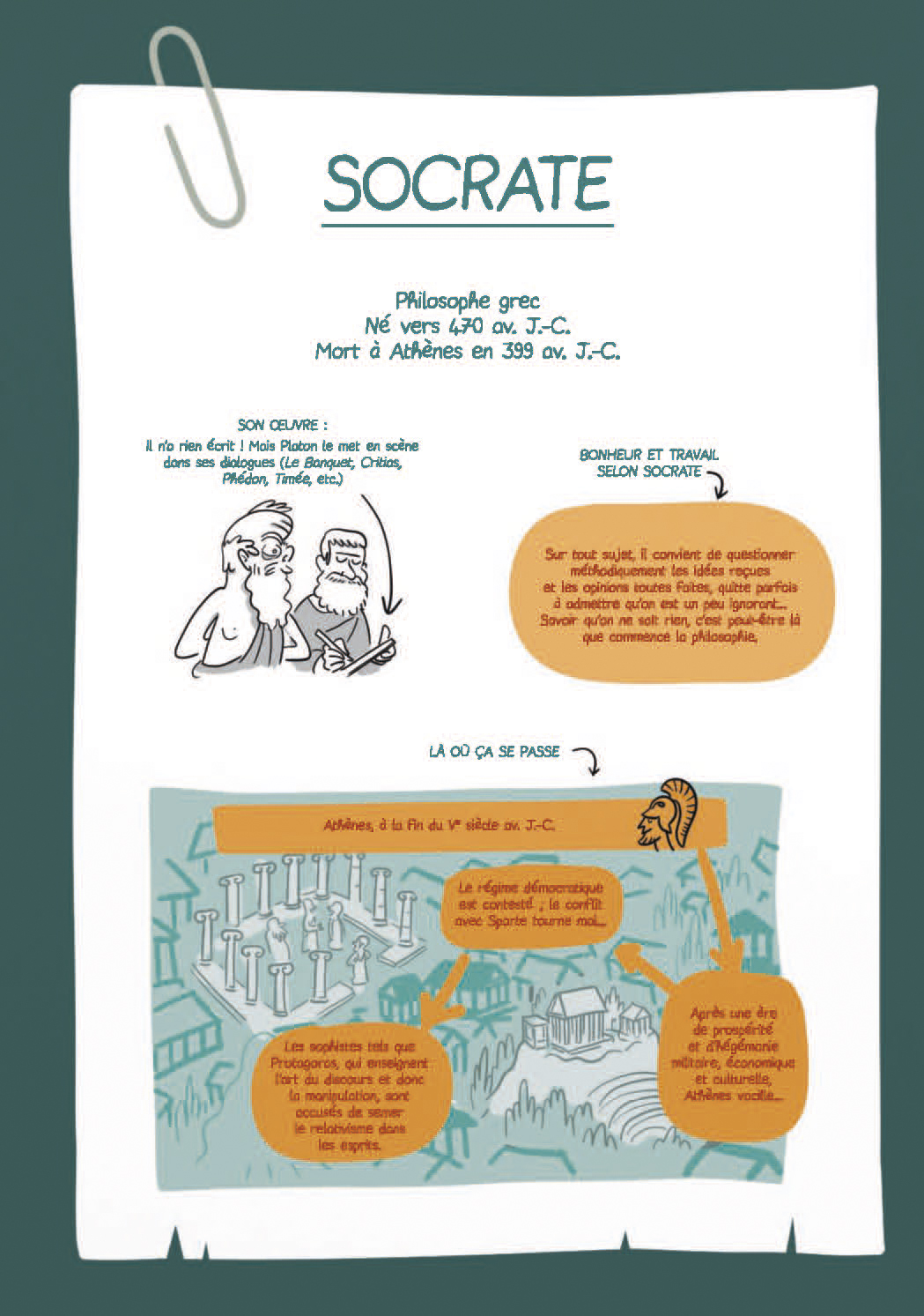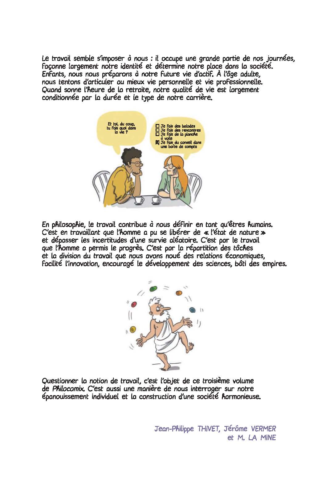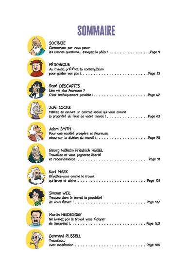 Le travail définit en grande partie notre identité, occupe une place majeure dans notre existence et constitue un marqueur essentiel de notre vie sociale. C’est de ce concept universel que s’emparent les auteurs de Philocomix pour enclencher de nouvelles réflexions sur le bonheur ! Est-ce qu’être un bon travailleur me suffit pour être heureux avec les autres ? La technique, source de progrès, permet-elle de vivre mieux et d’être plus heureux ? Puis-je être heureux si on ne me garantit pas la propriété du fruit de mon travail ? Autant de questions pour lesquelles sont convoqués René Descartes, Karl Marx ou encore Adam Smith au travers de 10 nouvelles approches philosophiques courtes afin de nous éclairer sur la place du travail dans notre société et dans nos vies personnelles.