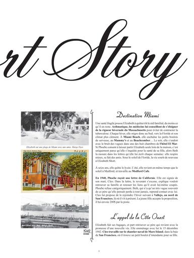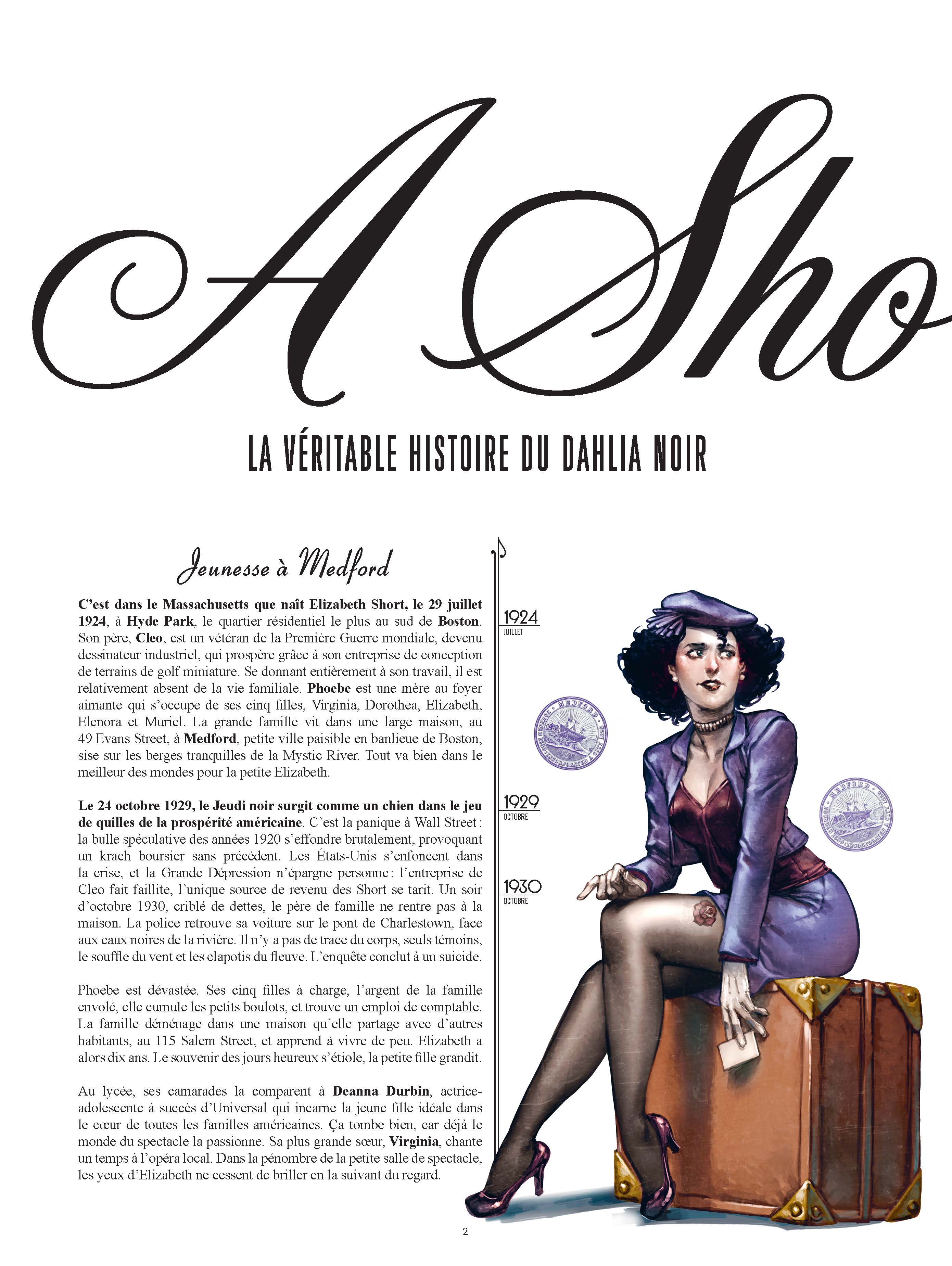A Short Story retrace avec un souci du détail sans précédent la vraie histoire d’Elizabeth Short, plus connue sous le pseudonyme du Dahlia Noir, qui avait quitté son Massachusetts natal pour s’installer à Los Angeles, envisageant une carrière de star hollywoodienne. L’histoire et les dialogues, écrits d’après les documents déclassifiés du FBI, retrace la vie de cette jeune femme perdue dans Hollywood, en particulier les 3 mois qui ont précédé son horrible assassinat, et repose sur les témoignages recoupés de gens l’ayant connue et côtoyée. De son séjour au Figueroa Hotel avec Marjorie Grahams, à l’incident des trois de San Diego, un récit méticuleusement documenté, loin des clichés habituels sur une figure féminine dont on pensait tout connaître.