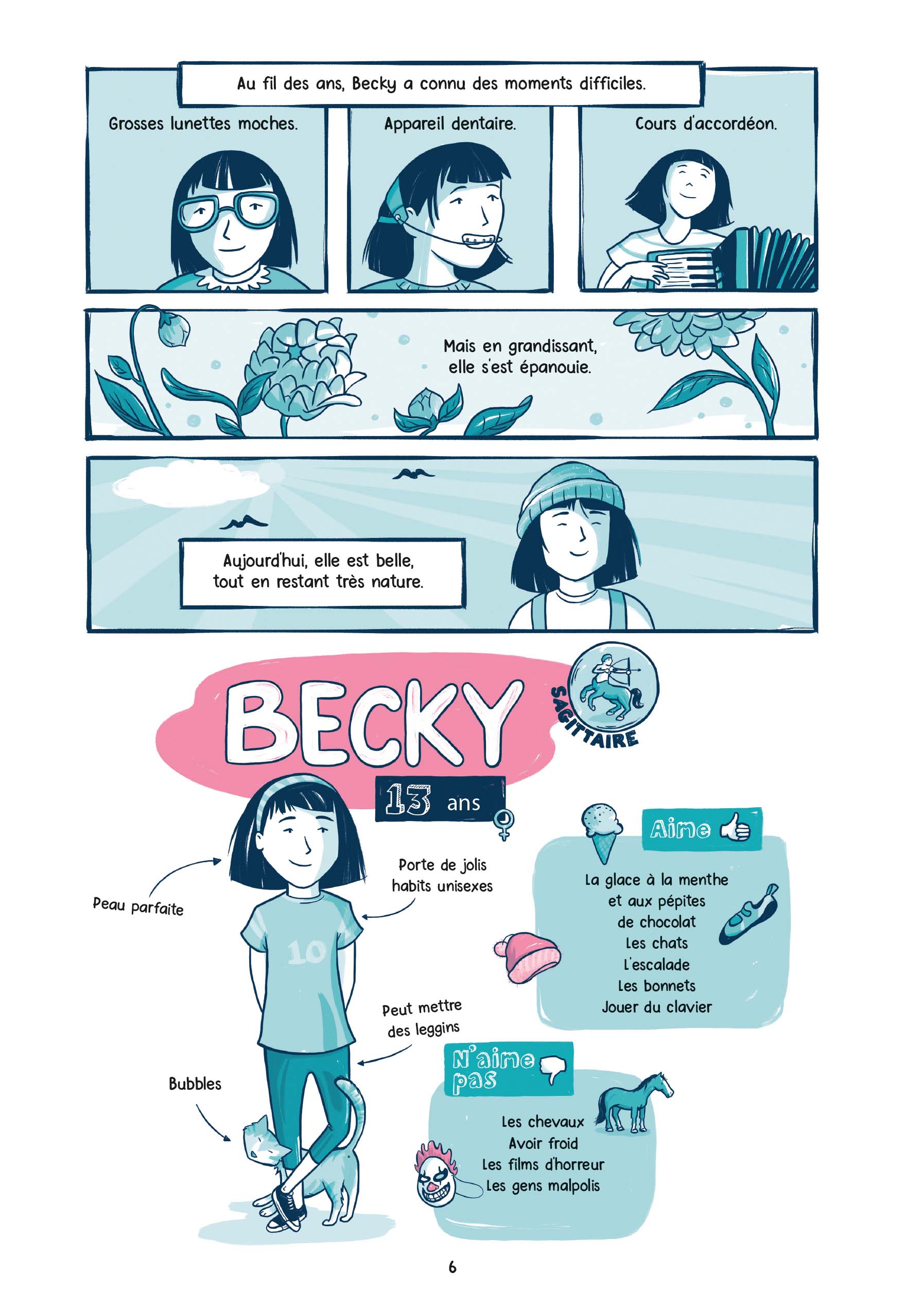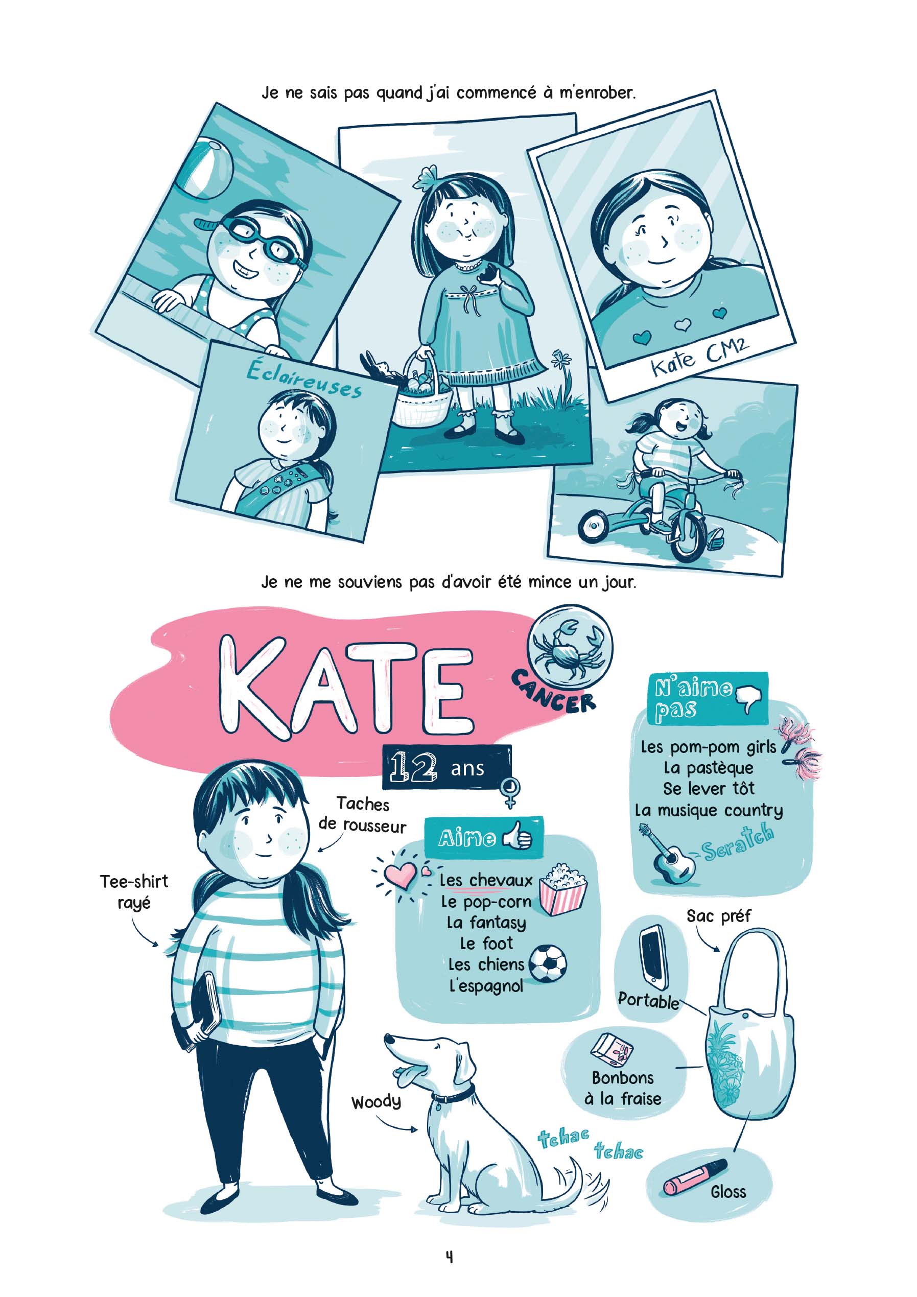 Rien ne fait plus plaisir à Kate que d’aller au Haras retrouver son cheval. C’est dommage que sa meilleure copine Becky soit allergique, elle aurait adoré avoir une alliée à ses côtés. Elle se sent vulnérable sans elle. Les filles qui montent avec elles sont des pestes en particulier quand elle fait une chute ce qui malheureusement lui arrive régulièrement. Et l’équilibre n’est pas son seul souci… elle n’est pas du tout sure d’elle, très complexée par son petit embonpoint auquel son gout pour les tshirt à rayures horizontales ne rend pas forcément hommage. Son frère Ross n’est pas cool et sous couvert de plaisanteries prend un malin plaisir à appuyer là où ça fait mal. Il est surtout entouré d’une bande de copains très cruels. Et puis il y a Matthew… il fait battre son cœur. Mais il s’intéresse visiblement davantage à Becky. Et avec tout ça, son examen de cheval la stresse particulièrement. Mais heureusement les choses finissent toujours par s’arranger.